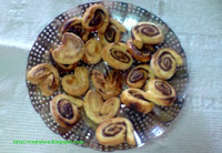Aplastarla ligeramente con el rodillo y cortarla en tiras de aproximadamente 1 cm. Colocar las palmeras en una bandeja de horno fría dejando espacio entre ellas, ya que al subir el hojaldre aumentan de tamaño.